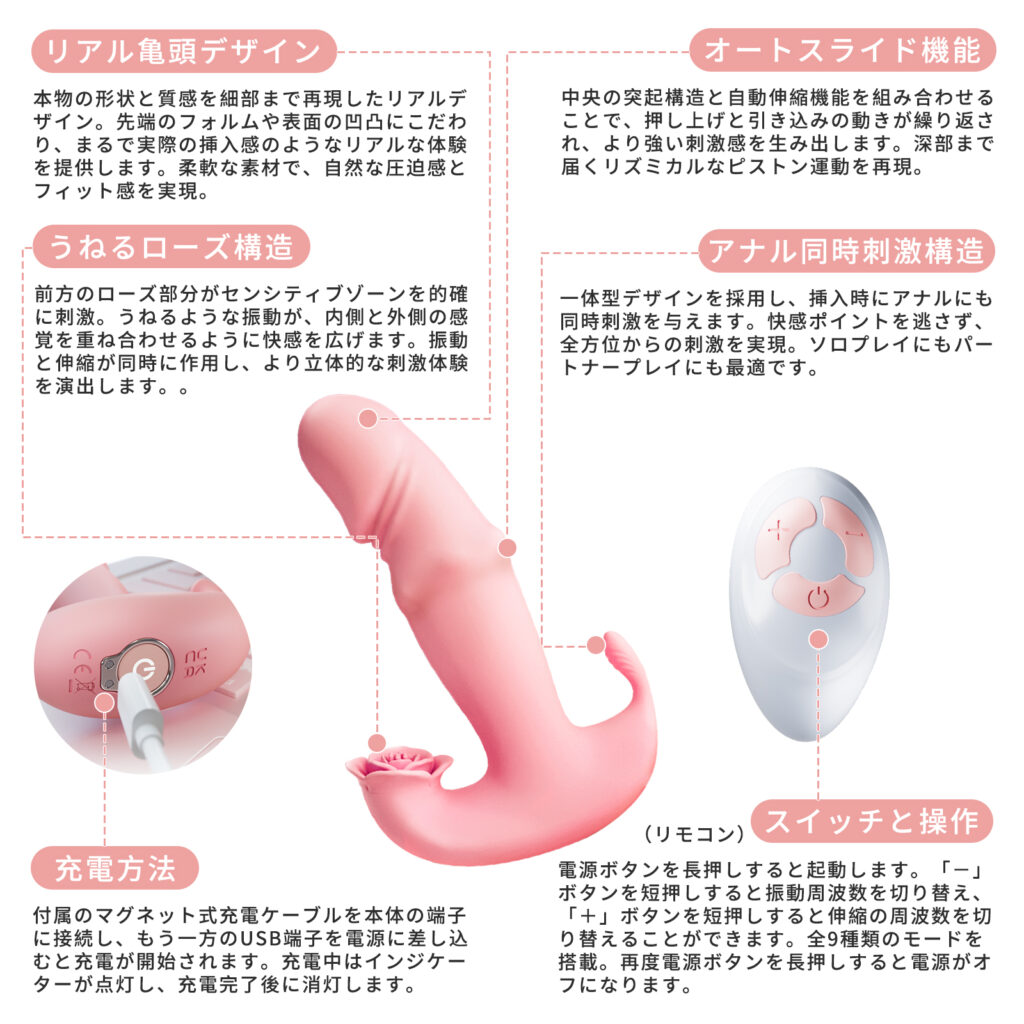 その美しく、かつ刺激的なデザインのローズデザイン・ピストンバイブは、あなたのセルフプレジャーにおいて新たな次元と強烈な快感が得られます。
